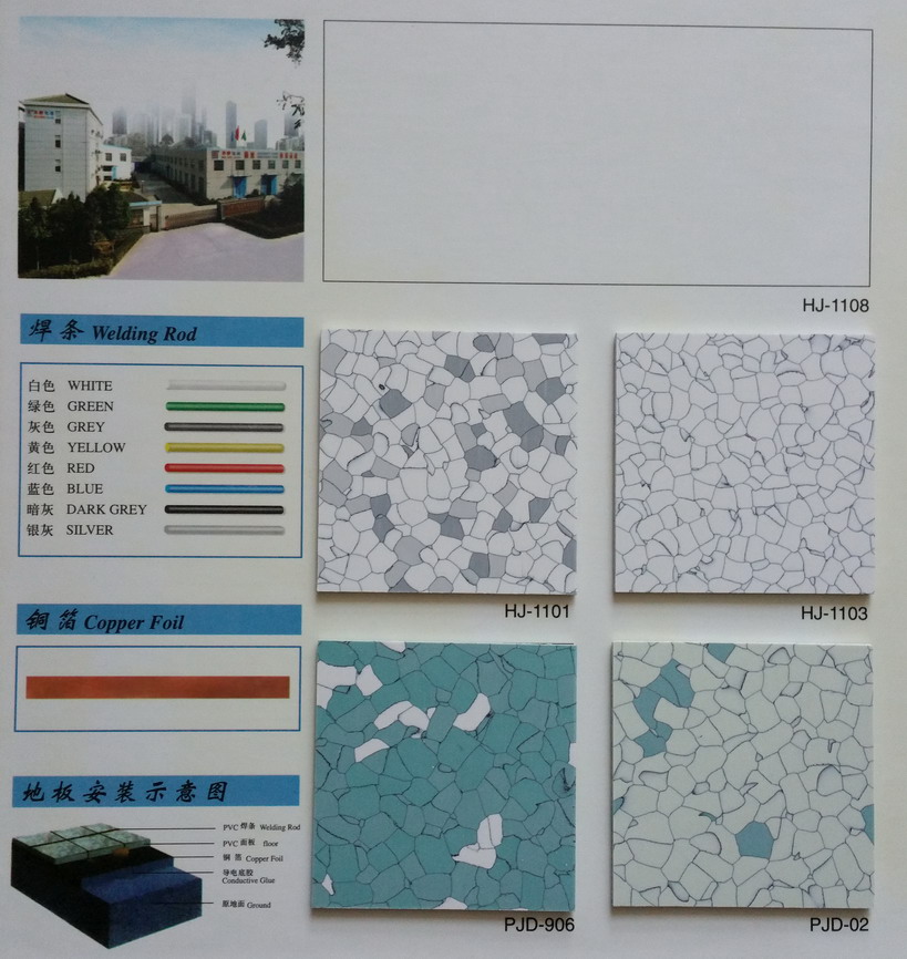 施工程序: 清掃地面—>鋪接地導(dǎo)電網(wǎng)—>引出地線(xiàn)—>涂導(dǎo)電膠—>鋪貼地板—>開(kāi)V型槽—>鋪設(shè)焊條—>熱焊修整—>表面清潔—>檢測(cè)性能。
