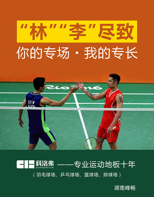 在以后的賽場上,可能再無林、李。但是在羽毛球的賽場上,會有更多的“林”、“李”譜寫這段傳奇,而專業羽毛球場地板廠家——科洛弗運動地板:適用于籃球場、網球場、羽毛球場、乒乓球場、排球場,綠色環保、抗沖擊、吸音、阻燃、防滑、腳感舒適、易清潔,品種多樣。在科洛弗運動地板上,這是屬于你們的專場,我們的專長!